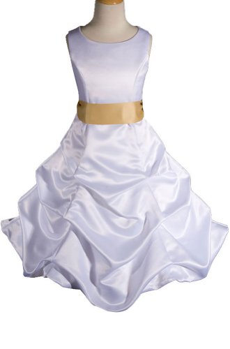 This Princess Dress is perfect for a Flower Girl Wedding Dress, Graduation Dress, Junior Bridesmaid Dress, Pageant Holiday Dress, Easter Dress, and a Special Dress for her birthday Party or Heavenly keepsake pictures. The entire dress is made out of high quality satin. There is a removable gold satin sash on the waistline. The pick-up style skirt has 3 layers with a crinoline netting inside for additional fullness. The back of the dress has a hidden zipper and a tie sash for a perfect fit at the waist. Absolutely Gorgeous!