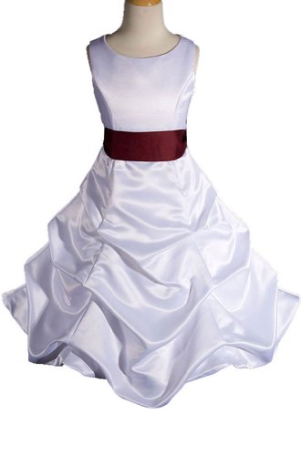 This Princess Dress is perfect for a Flower Girl Wedding Dress, Graduation Dress, Junior Bridesmaid Dress, Pageant Holiday Dress, Easter Dress, and a Special Dress for her birthday Party or Heavenly keepsake pictures. The entire dress is made out of high quality satin. There is a removable burgundy satin sash on the waistline. The pick-up style skirt has 3 layers with a crinoline netting inside for additional fullness. The back of the dress has a hidden zipper and a tie sash for a perfect fit at the waist. Absolutely Gorgeous!