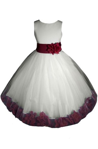 This Princess Dress is perfect for a Wedding as a Flower Girl Dress, Pageant Holiday Dress, Easter Dress, and a Special Dress for her birthday Party or Heavenly keepsake pictures. This elegant bodice is made out of ivory satin. There is a removable burgundy satin sash with a flower on the waistline to make this dress more beautiful. The skirt has 4 layers, the inside layer is satin attached with a netting for additional fullness, the middle layer is soft satin, and the outside layer is actually a double layer of fluffy tulles with burgundy rose petals in the bottom of the dress. The back of the dress has a hidden zipper and a tie sash for a perfect fit at the waist. Absolutely Gorgeous!