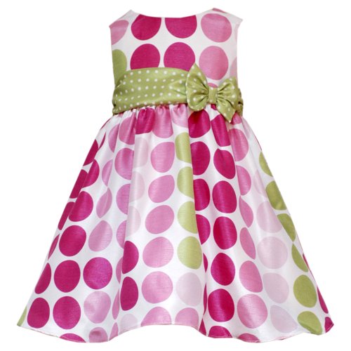 Beautiful FUCHSIA-PINK & LIME-GREEN SHANTUNG DOT DRESS features SLEEVELESS BODICE with GREEN/WHITE-DOTTED BAND & SIDE BOW TRIM at the the waist. Fully lined, knee-length IVORY SHANTUNG SKIRT features PINK/GREEN MULTI DOTS and attached slip with ruffled crinoline underskirt for added fullness plus back zip closure and GREEN/WHITE-DOTTED BOW TIE SASH IN BACK. Comes with matching/coordinating WHITE PANTY/BLOOMER. Machine washable. Imported (Philippines). Of polyester - Lining of polyester/nylon - Exclusive of trim/decoration. Matching/Coordinating sister styles available in sizes 3M-16, search for style(s): RRE-56522. More baby & girl party dresses available, search for: "rre-girl-party-dress "