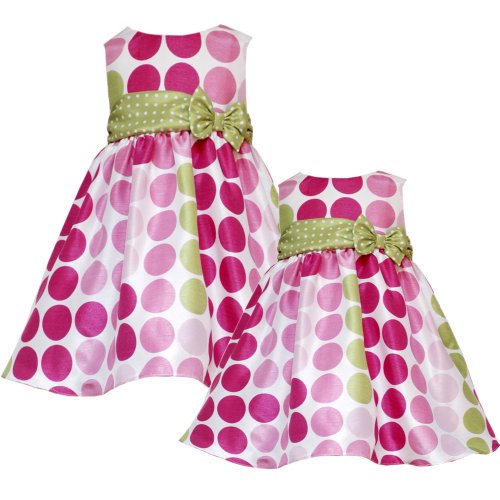 Beautiful FUCHSIA-PINK & LIME-GREEN SHANTUNG DOT DRESS features SLEEVELESS BODICE with GREEN/WHITE-DOTTED BAND & SIDE BOW TRIM at the the waist. Fully lined, knee-length IVORY SHANTUNG SKIRT features PINK/GREEN MULTI DOTS and attached slip with ruffled crinoline underskirt for added fullness plus back zip closure and GREEN/WHITE-DOTTED BOW TIE SASH IN BACK for perfect fit. Machine washable. Imported (Philippines). Of polyester - Lining of polyester/nylon - Exclusive of trim/decoration. Matching/Coordinating sister styles available in sizes 3M-16, search for style(s): RRE-56522. More baby & girl party dresses available, search for: "rre-girl-party-dress "